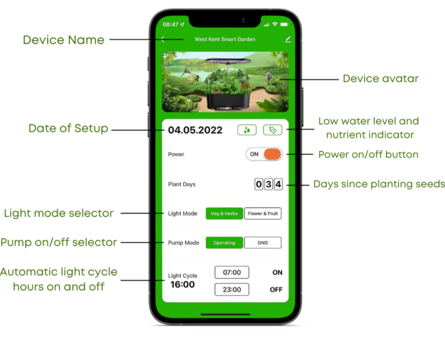 - Smart app lets you check water levels, modify the light spectrum and change water pump and light schedules remotely
